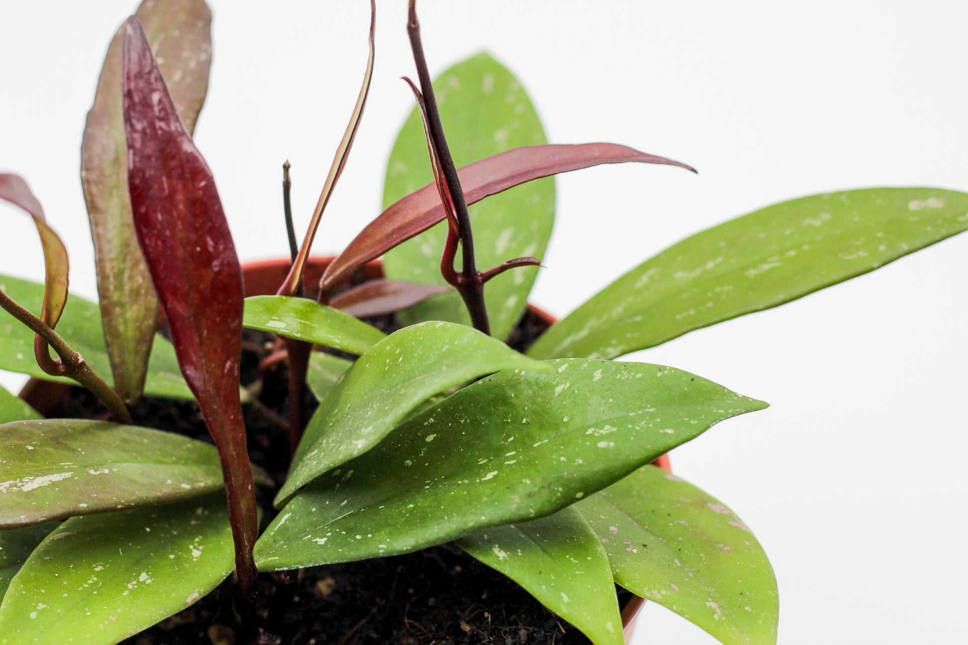 The Hoya Sunrise is a beautiful Hoya variety. It produces thick, elongated leaves with a pointed tip. Its leaves are light green, and the veins are clearly visible. When the leaves of this Hoya receive a lot of sun, they turn orange-red. This protects them from the sunlight. The color is reminiscent of the glow in the sky at sunrise, hence the name Sunrise. The Hoya Sunrise produces thin tendrils on which its leaves grow. You can either guide these tendrils or let them hang.