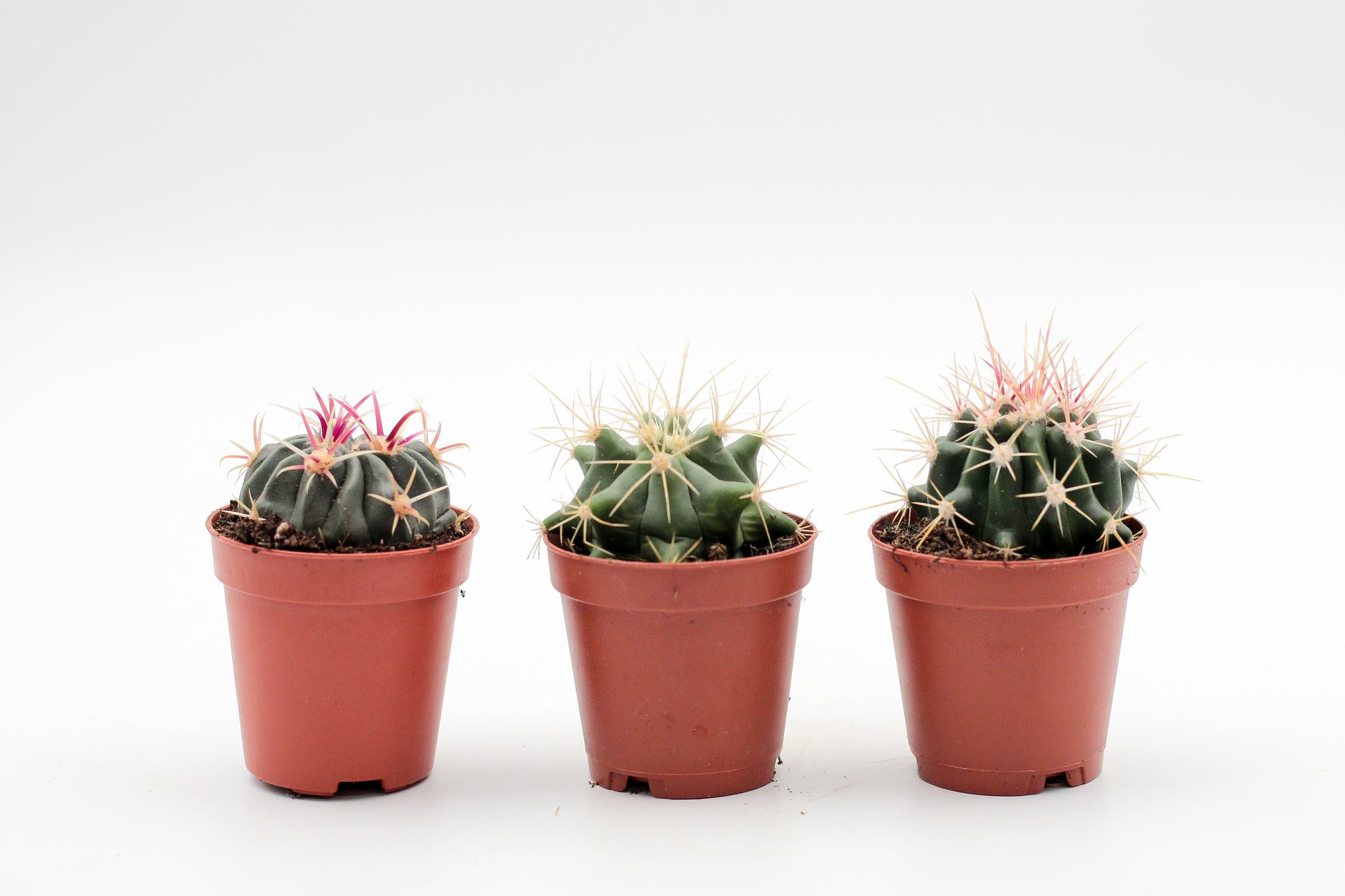 FeroFriends! Een leuk trio van Ferocactussen. De Ferocactus is een imposante bolcactus die in de natuur veel voorkomt in Mexico en de Verenigde staten. Hier groeien ze uit tot een flink formaat. Bij ons thuis op de vensterbank loopt dit meestal wel los. We hebben voor deze set 3 leuke Ferocactus soorten geselecteerd voor je. Het zijn nog jonge plantjes, dus een leuke missie voor jou om ze verder op te laten groeien.