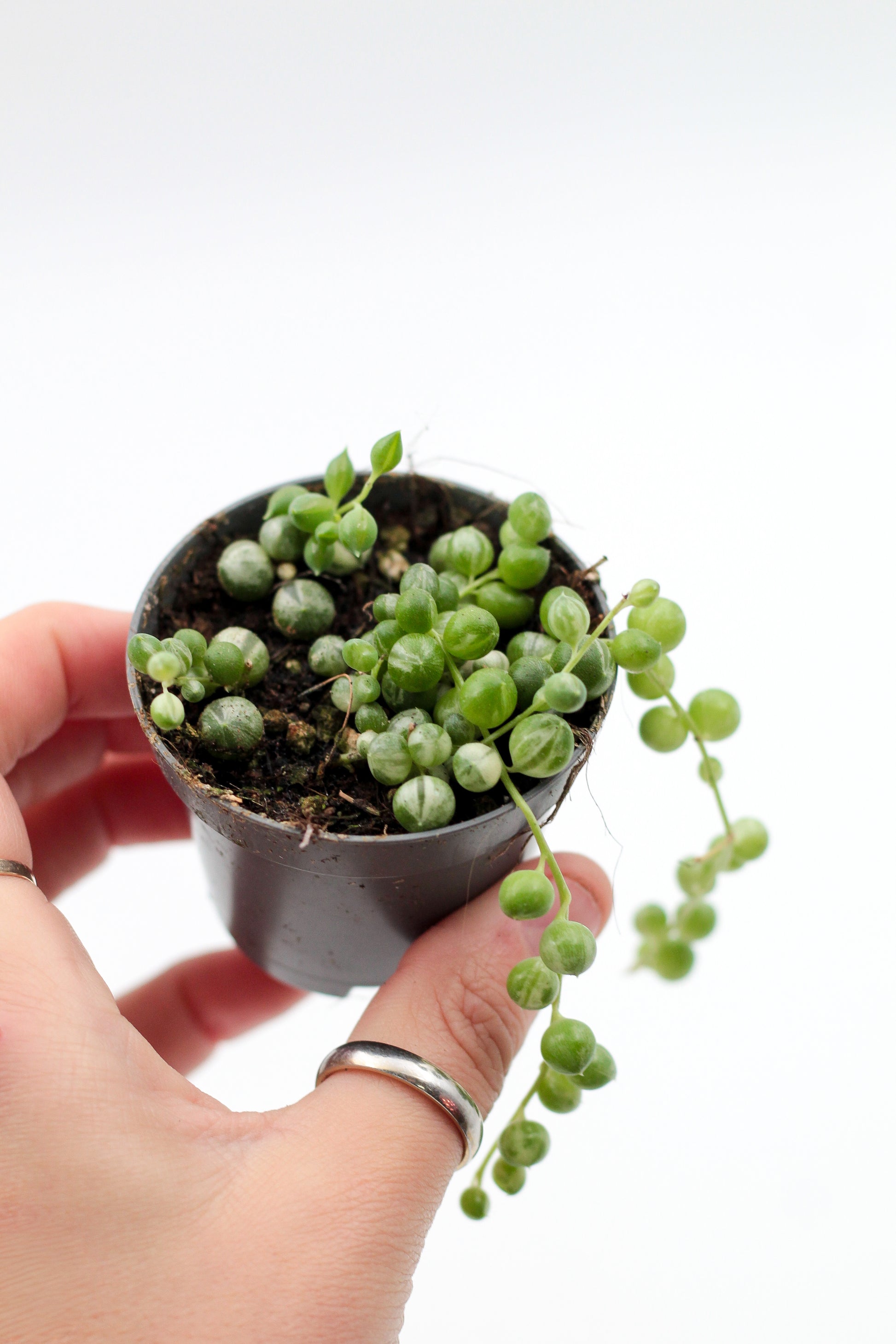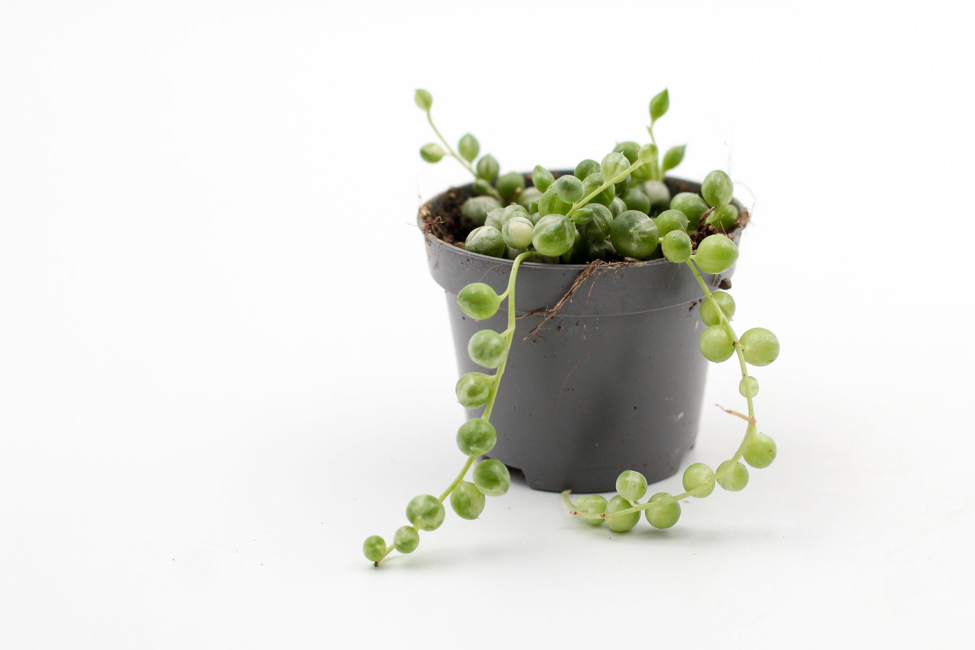 De Senecio Rowleyanus variegata is een prachtige en zeldzame vetplant soort. Bij deze variegata variant van de Senecio Rowleyanus hebben de bladeren een prachtige bonte kleur. Doordat er bladgroen ontbreekt krijgen ze een mooi lichtgekleurd patroon op de bladeren. Hierdoor hebben ze ook wel de bijnaam variegated string of pearls en bonte parelmoer snoer gekregen.